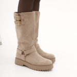 Modello Stivale realizzato in simil-camoscio Tortora. Chiusura con zip nella parte laterale interna e lacci nella parte anteriore. Caratterizzato da fibbie dorate. Disponibile anche nel colore Nero