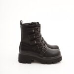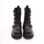 Modello Stivaletto realizzato in eco-pelle nero. Chiusura in zip nella parte interna laterale. Caratterizzato nella parte anteriore con cinte e fibbie.