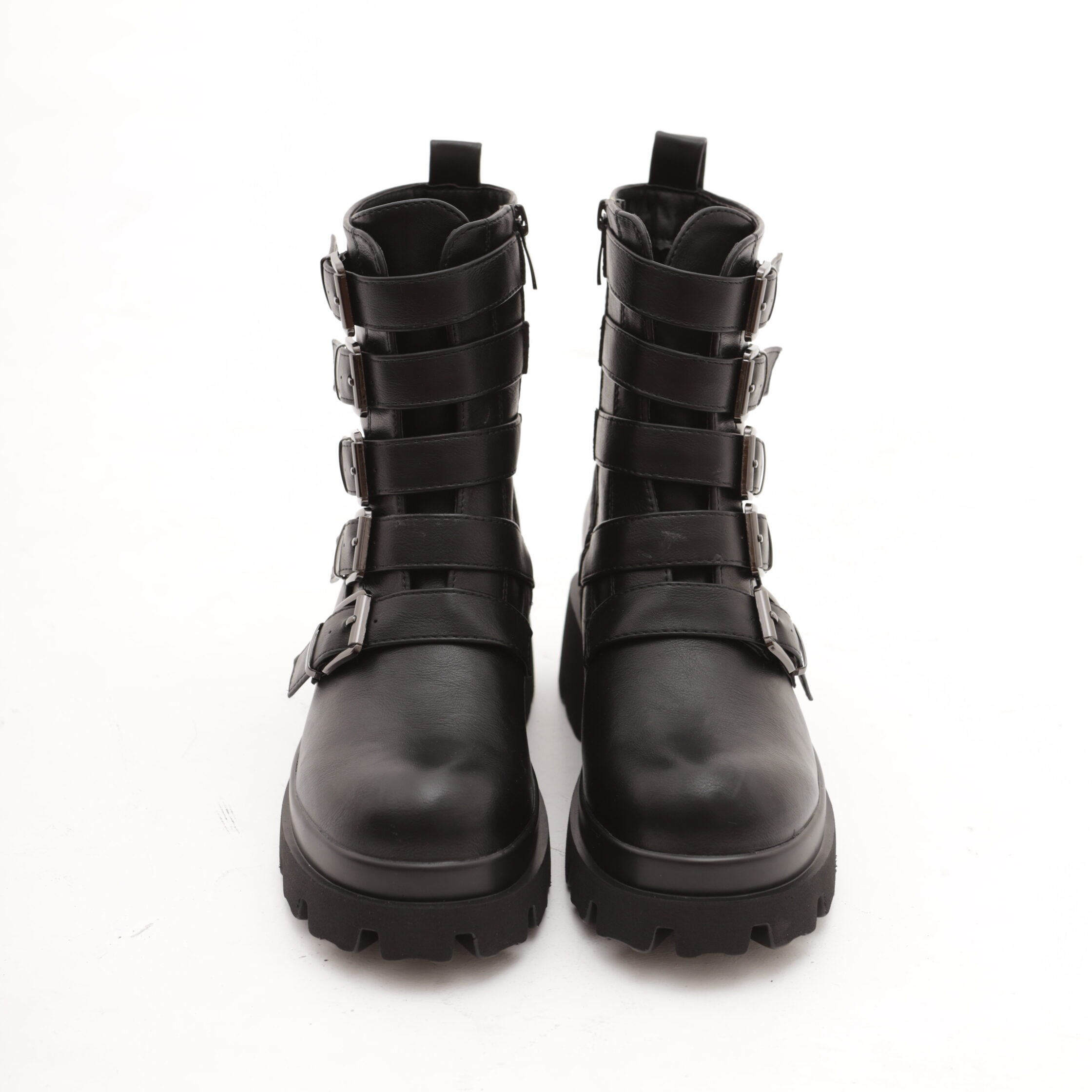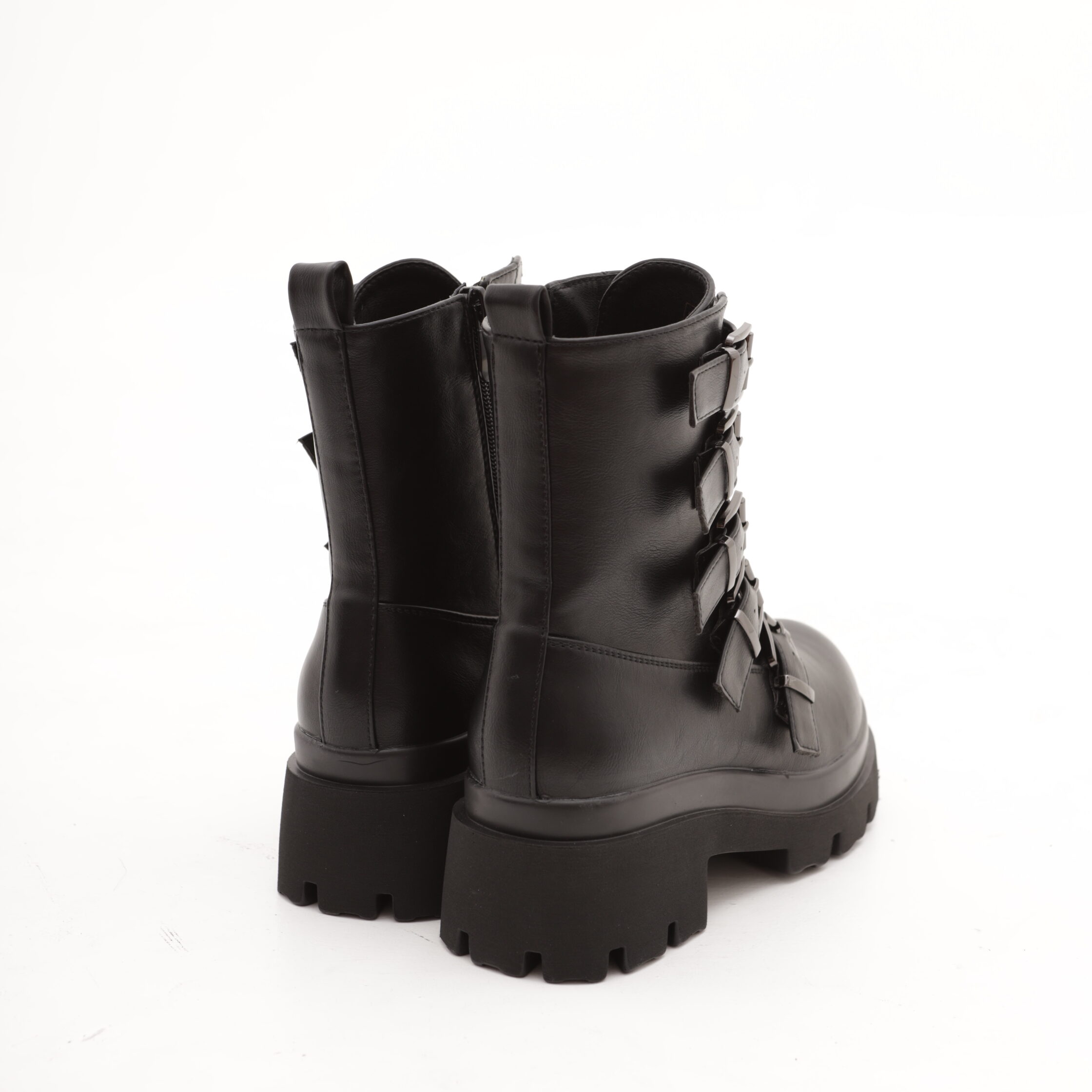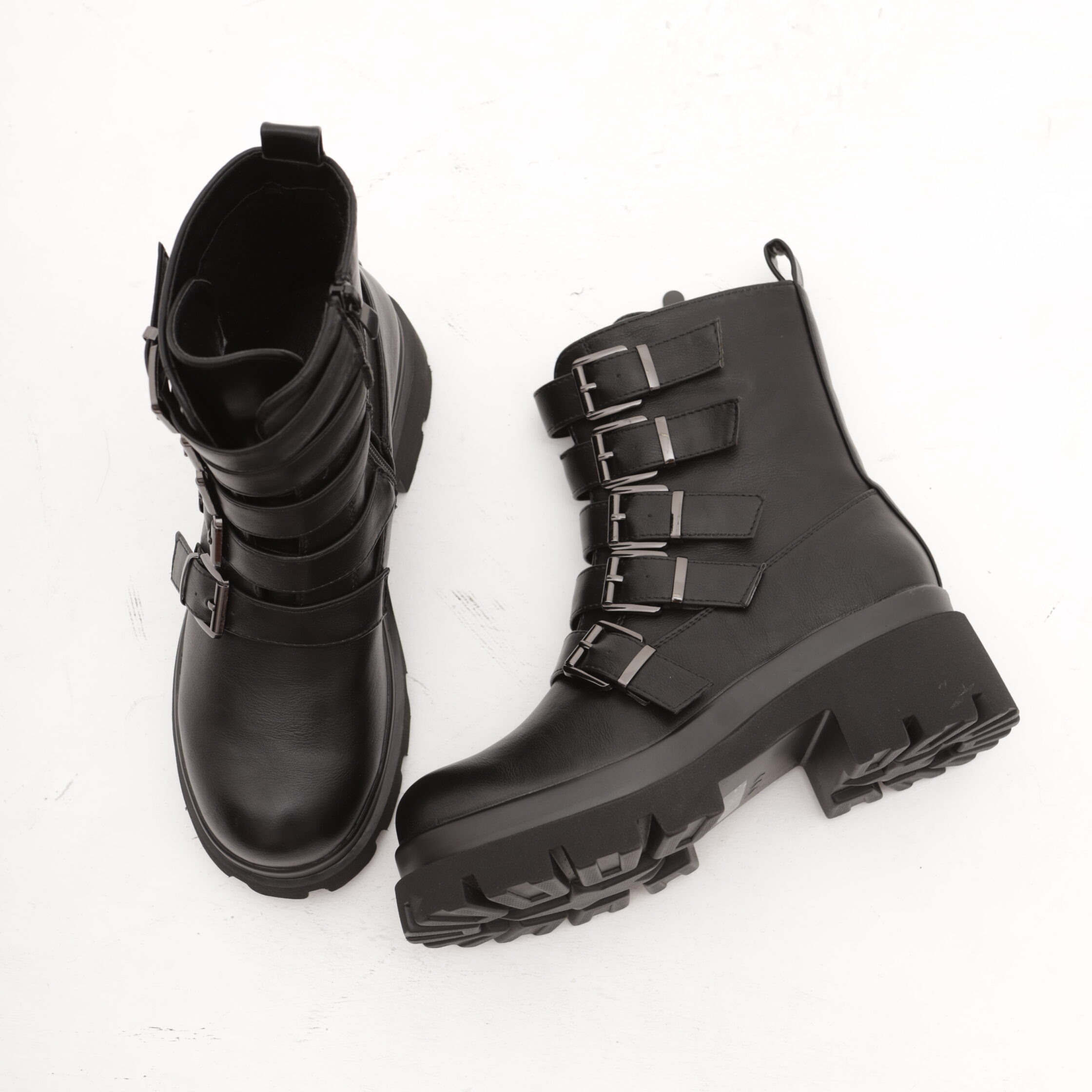 Modello Stivaletto realizzato in eco-pelle nero. Chiusura in zip nella parte interna laterale. Caratterizzato nella parte anteriore con cinte e fibbie.