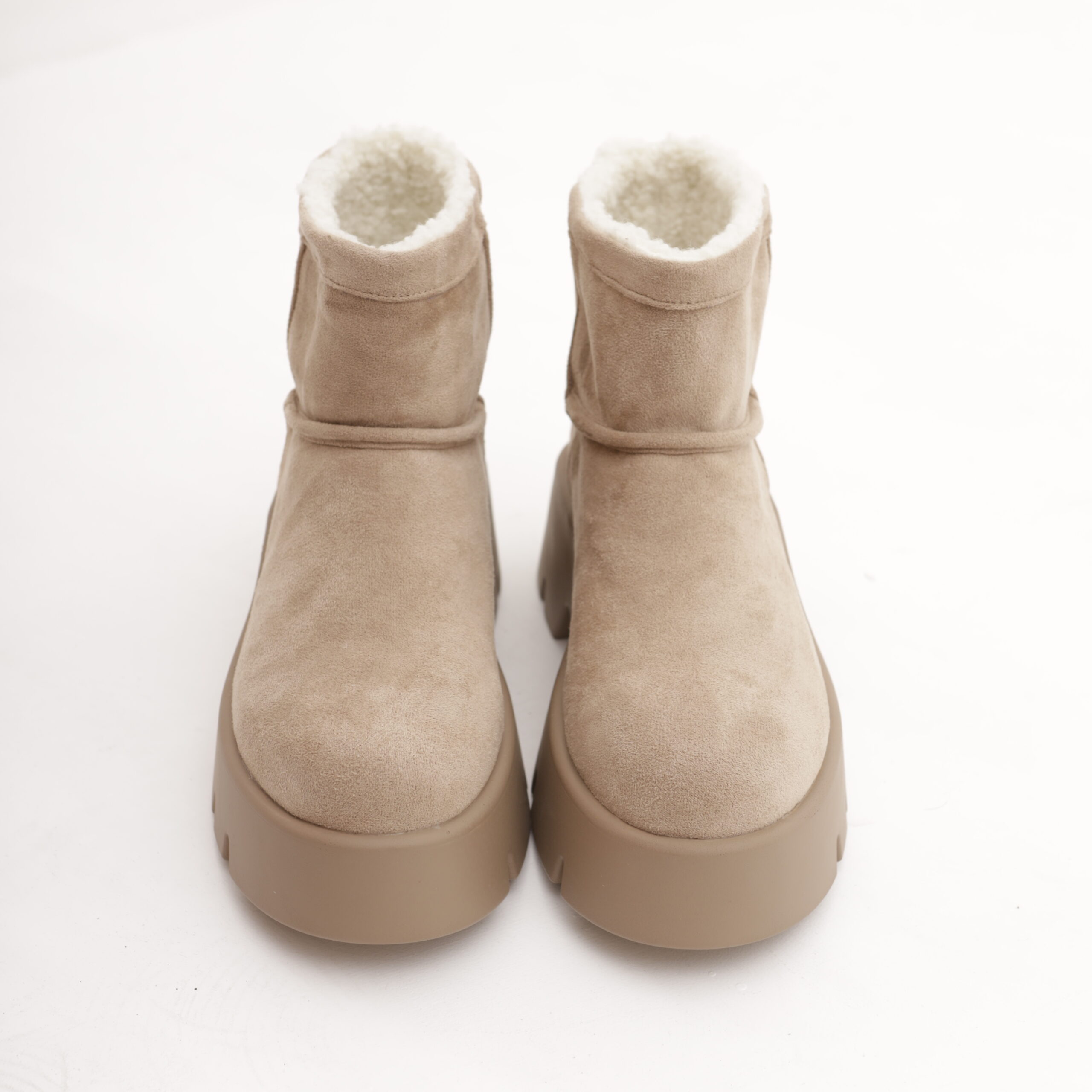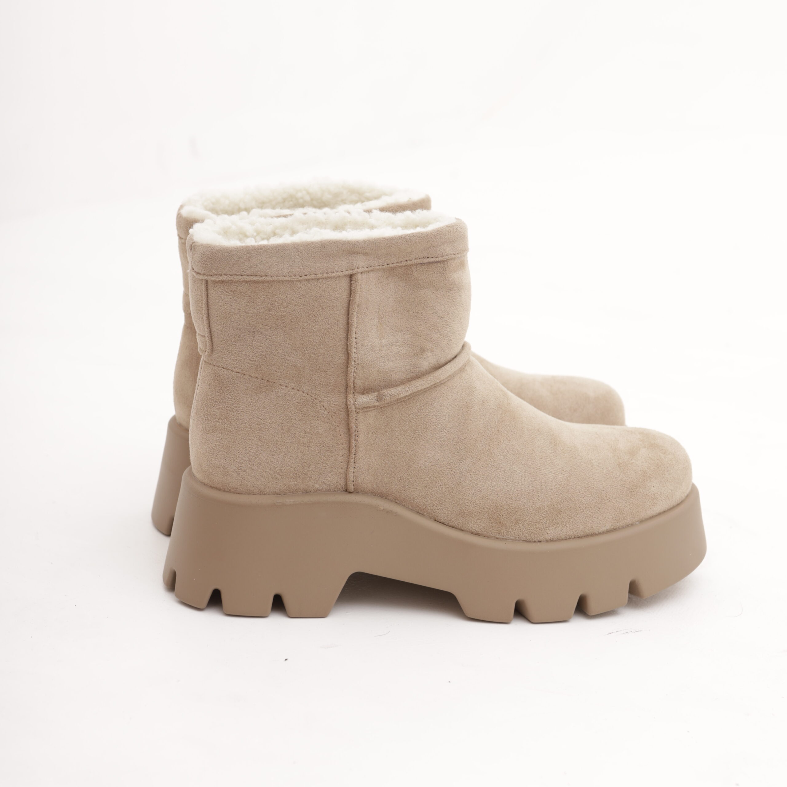 Modello Stivaletto realizzato in simil-camoscio Tortora. Disponibile anche in Nero.
